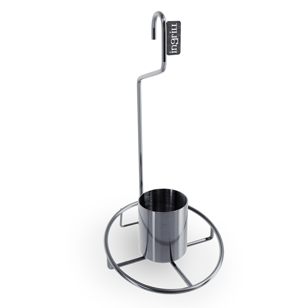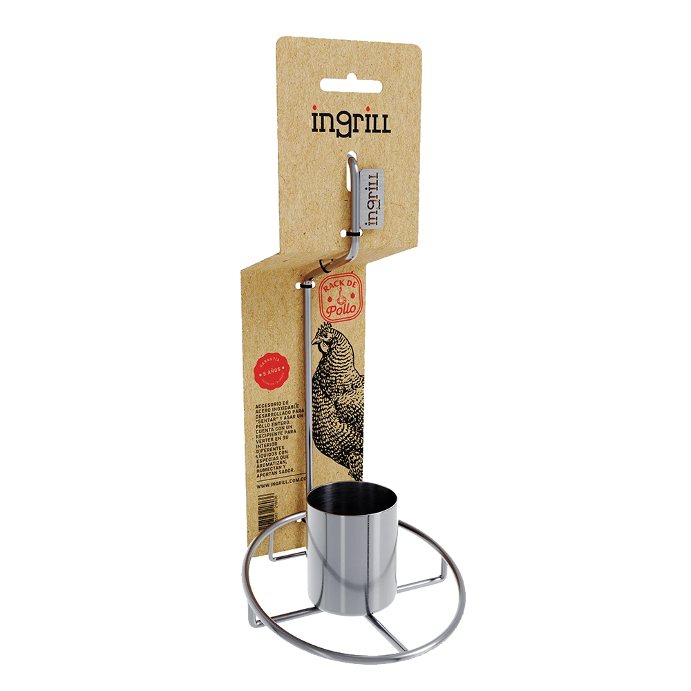 Soporte de acero inoxidable 304, donde acomodas un pollo entero, cuenta con un vaso de aluminio, donde puedes preparar tus especias preferidas para adobar el pollo.